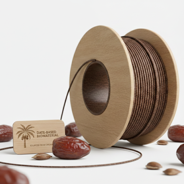 Nuestros pellets de EcoDates combinan la dureza del hueso del dátil con polímeros biodegradables para una impresión 3D de alta calidad, con un aspecto natural de madera y color que recuerda a un dátil maduro.